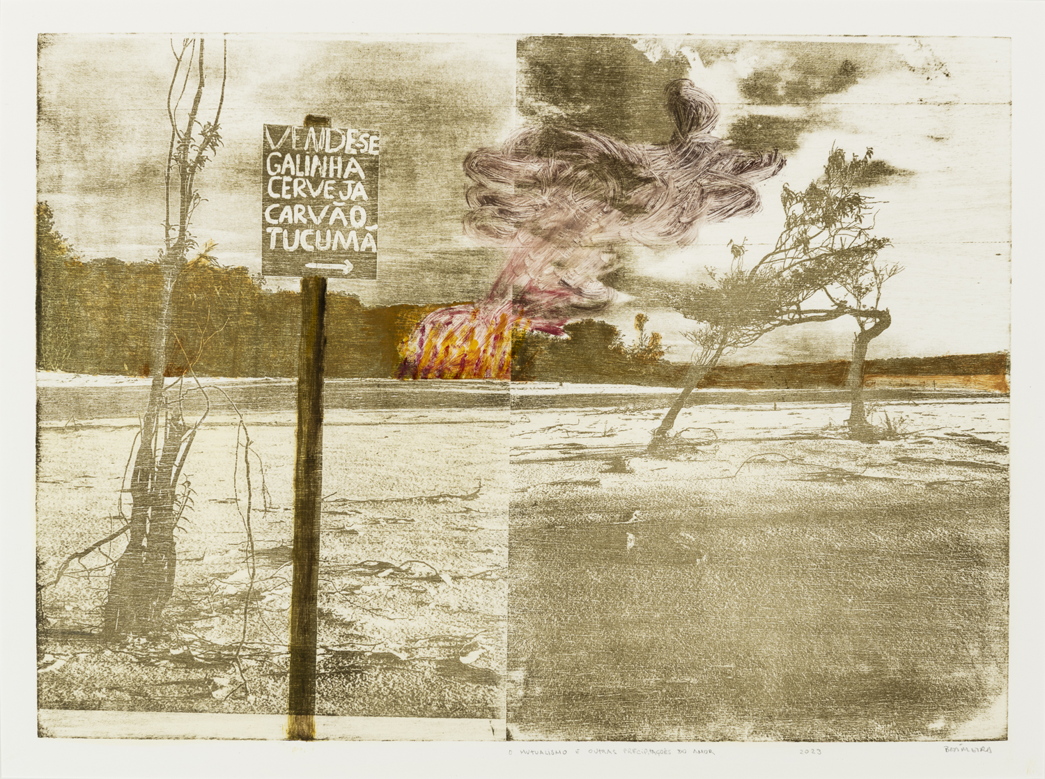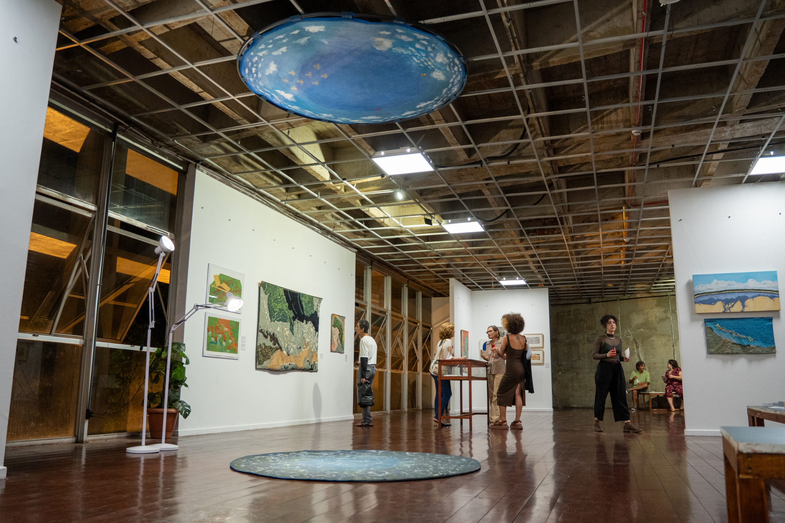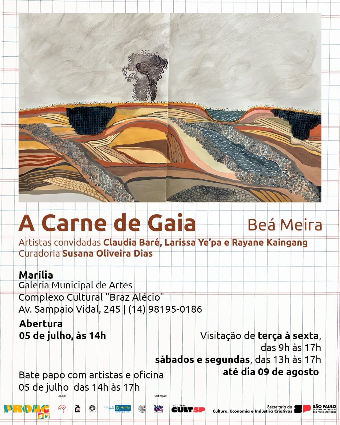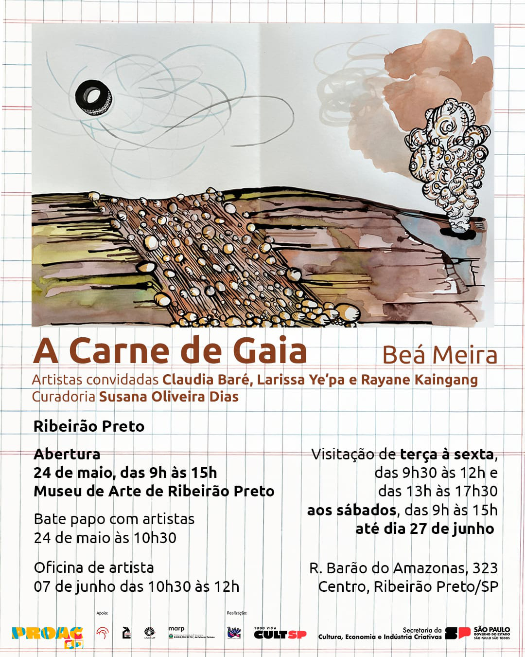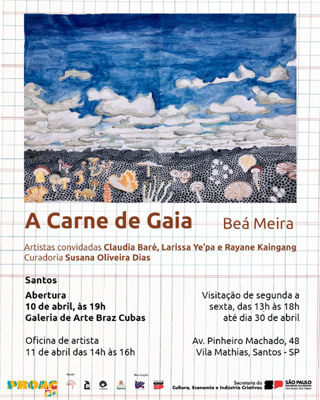 A artista Beá Meira exercita a arte de dar a ver aquilo que não queremos perceber: a catástrofe já está aí. Desenhos, pinturas, tapeçarias, mokulitos e gravuras, produzidos nos últimos 20 anos de trabalho da artista, nos fazem mergulhar em uma experiência estética de viver em um mundo radicalmente diminuído e tóxico. Estamos diante de terríveis destruições devido às atividades humanas capitalizadas e das evidências do colapso, que são abafadas para que o progresso irrefreado persista. Sentimos como estamos fazendo, justamente, aquilo que a filósofa das ciências Isabelle Stengers advertia que não devíamos fazer: compondo com o capitalismo ao invés de lutar contra ele.