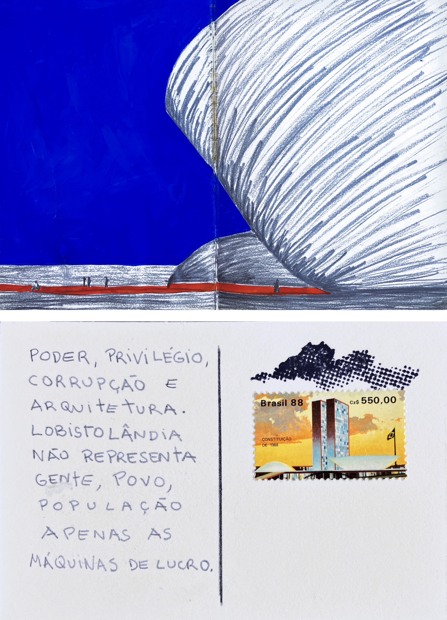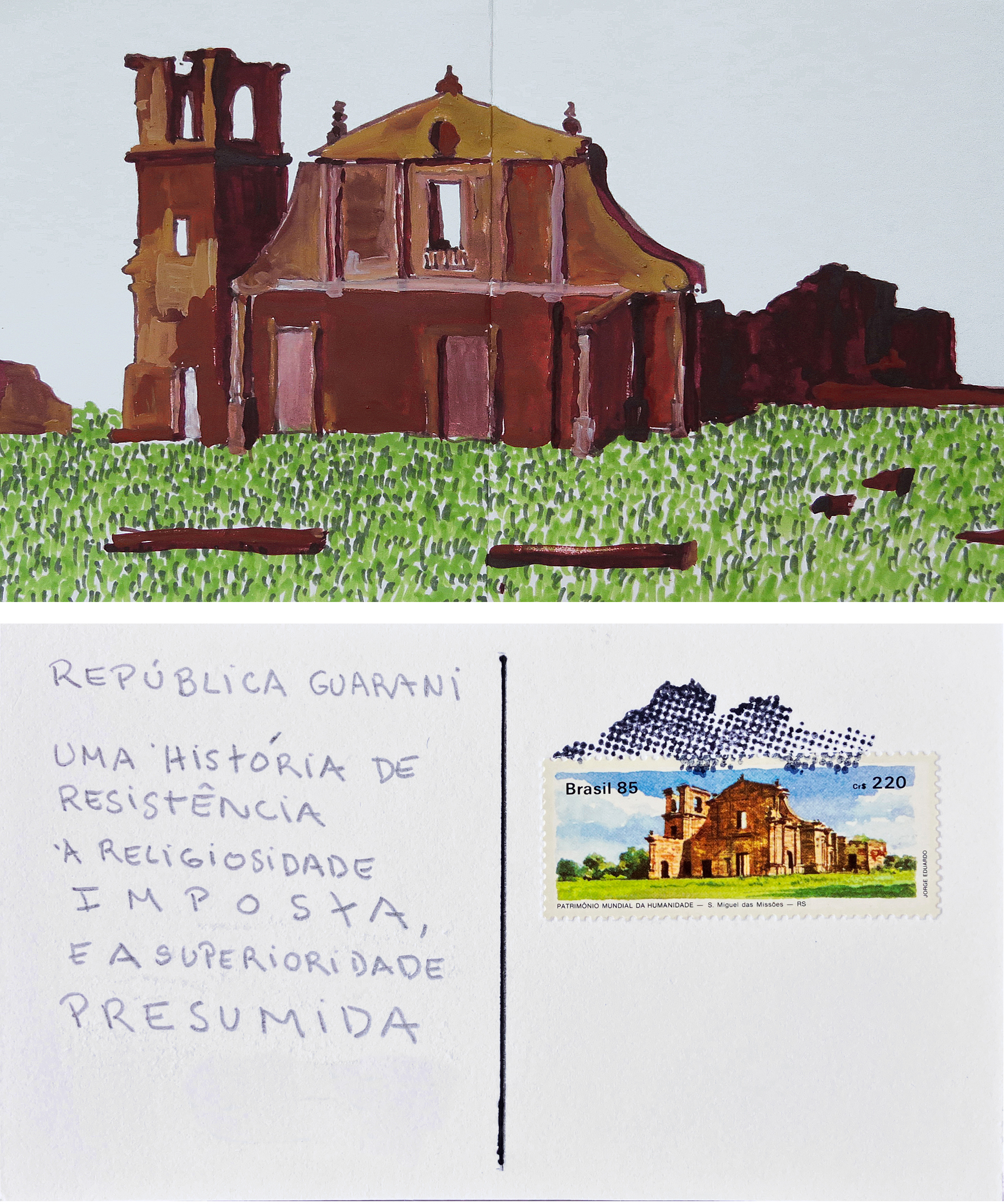 Mapa da América do Sul construído com cartões postais desenhados pela artista.